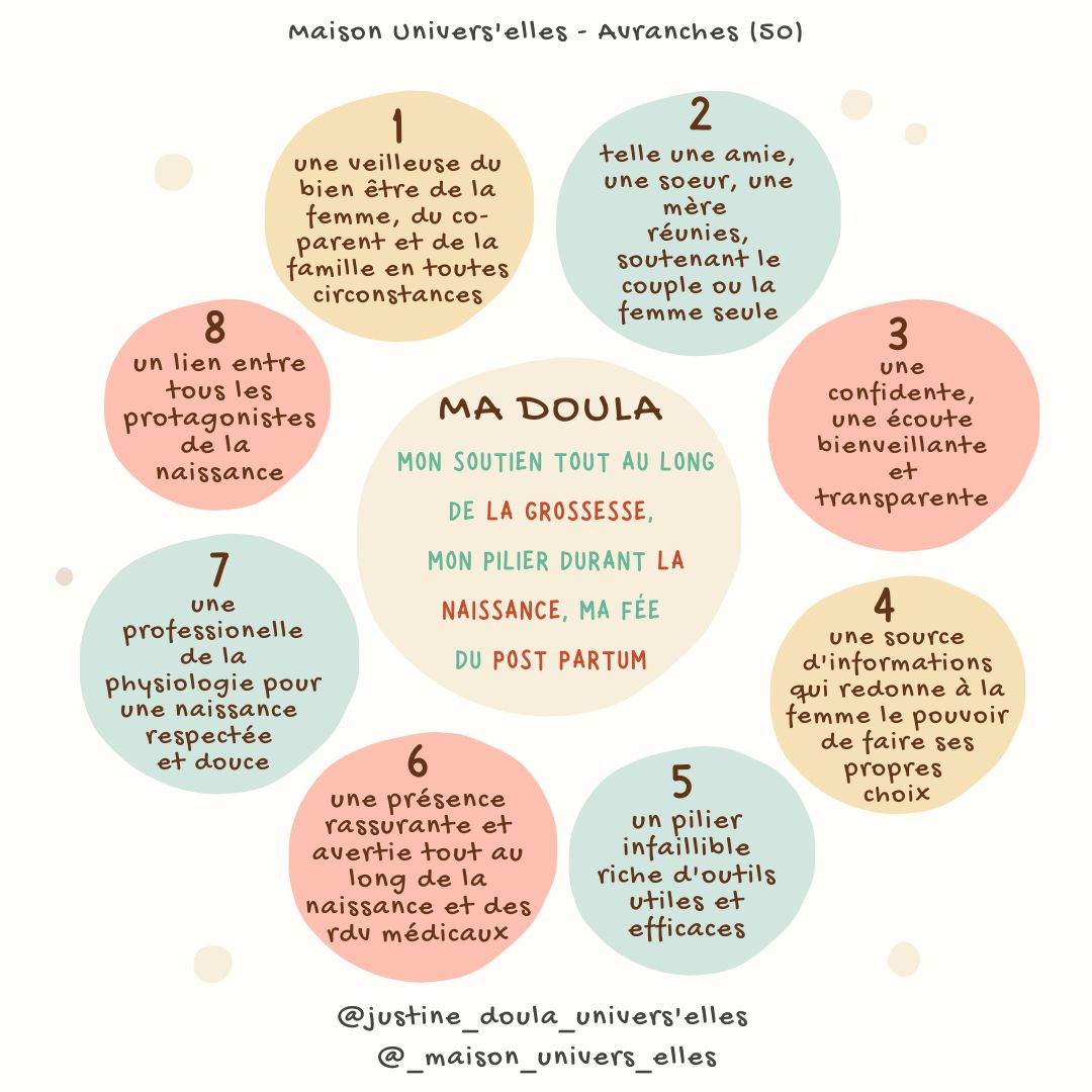 massage, soutien à l'allaitement, soin bien être rebozo, logistique à la maison, portage, appréhension du post partum, mise en relation avec les professionnels du réseau local, partages d'informations -