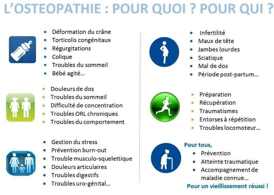 Ostéopathie articulaire, vertébrale, viscérale et crânienne. Traitement nourrisson, enfant, adulte, femme enceinte, seniors, sportif et personne à mobilité réduite. Ouvert 7j/7, jours fériés inclus Urgences et Domiciles assurés. Consultation sur RDV.