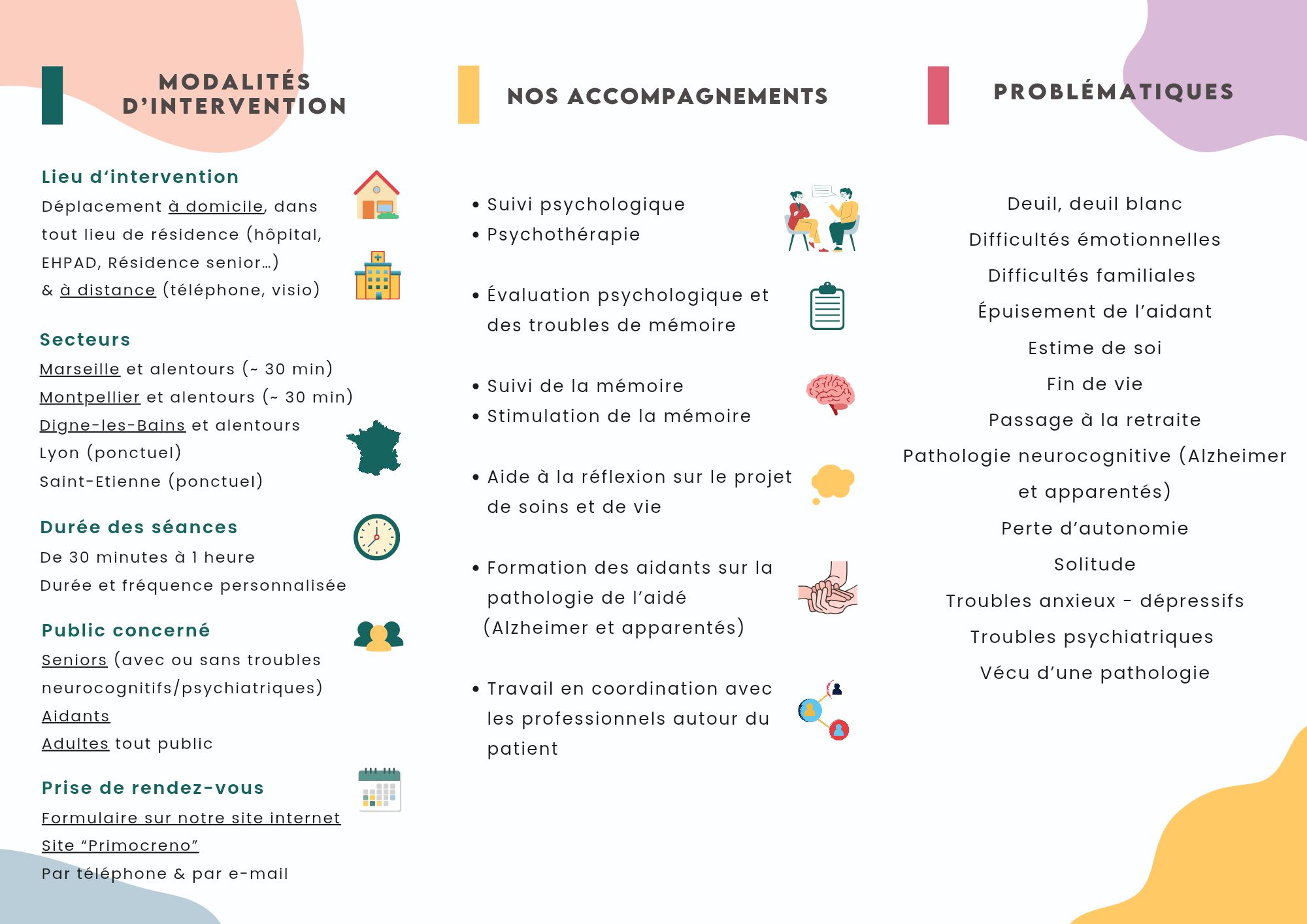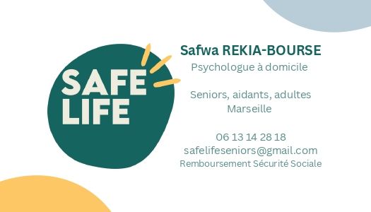 Safe Life Seniors est une équipe de 8 psychologues à domicile intervenant depuis 2021 à Marseille et alentours, spécialisée auprès des personnes âgées et aidants. - Publics : seniors, aidants, personnes à mobilité réduite et adultes tout venant - Pour tout type de problématique psychologique liée aux seniors et aidants (deuil, maladie, perte d'autonomie, dépression, Alzheimer et apparentés...) - Prise de RDV sur notre site internet (formulaire en ligne), Primocreno, Doctolib (Safwa Rekia - Aurélie Chambon), ou par mail safelifeseniors@gmail.com Remboursement possible par la sécurité sociale (12 séances par an), par France Parkinson, le réseau SLA, par le dispositif OSCAR (CARSAT), ou votre mutuelle