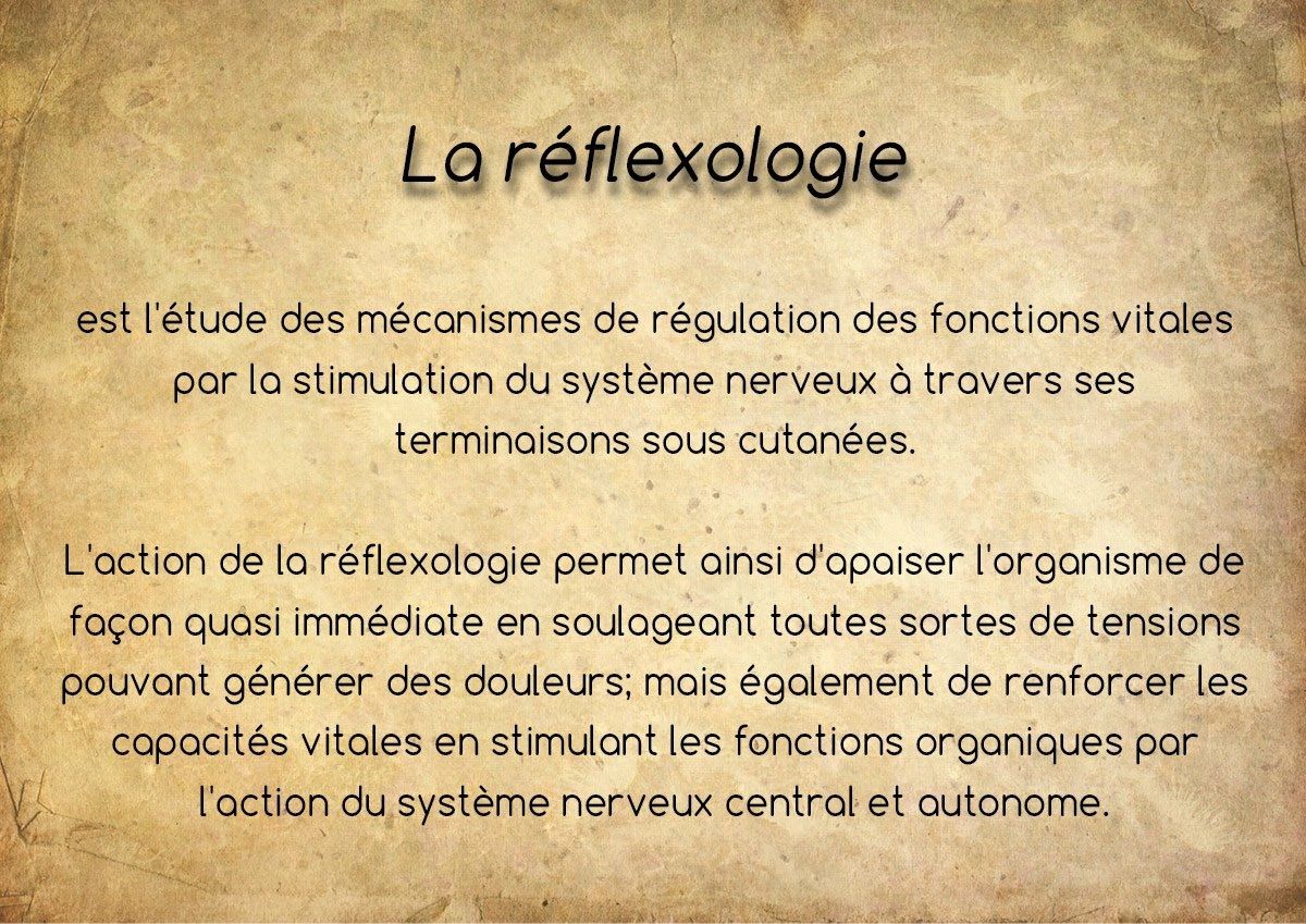 Via les zones réflexes situées sous le pied, la réflexologie plantaire agit sur les organes afin d'aider le corps à retrouver ses capacités d'auto régulation. Soin par excellence pour traiter différents maux du quotidien liés au stress