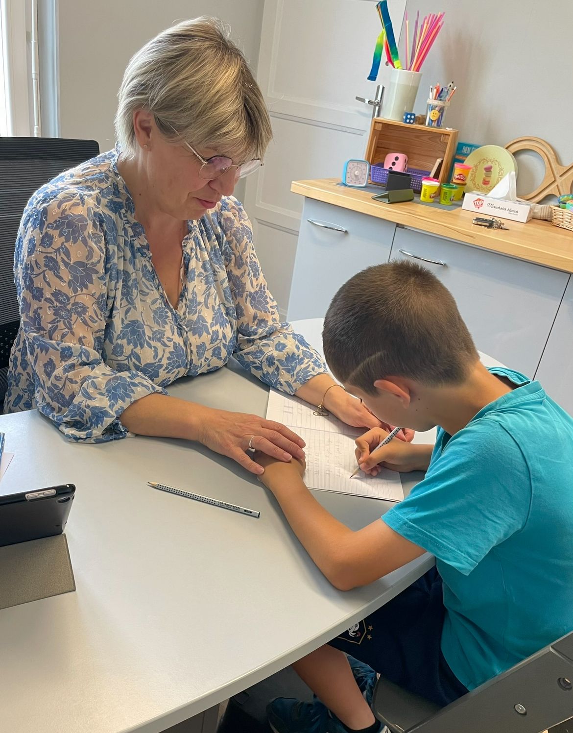 Pendant 25 ans, j’ai exercé comme professeure des écoles. C’est au fil des années, en accompagnant des élèves en difficulté avec l’écriture, que j’ai choisi de me spécialiser et de me former à la graphopédagogie auprès de l'Association E5. Depuis 2018, j’accompagne, dans mon cabinet, enfants, adolescents et adultes qui rencontrent des difficultés pour écrire : crispations, lenteur, illisibilité, douleurs… Mon approche est personnalisée, progressive et bienveillante, avec des outils concrets pour redonner à chacun confiance et le plaisir d’écrire.